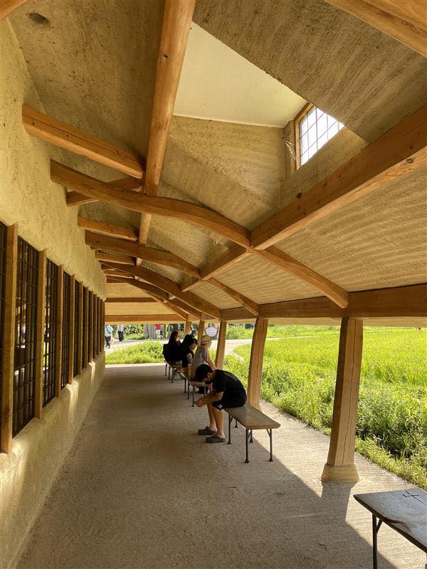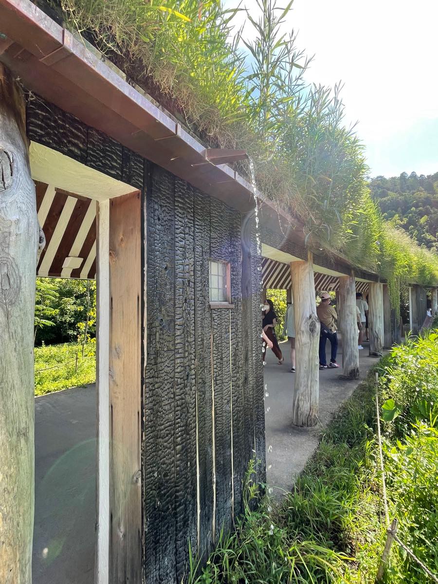 土壁や焼杉といった素材、深い軒先、太い柱など、土着的でどこか懐かしさを感じさせる建築が特徴的でした。