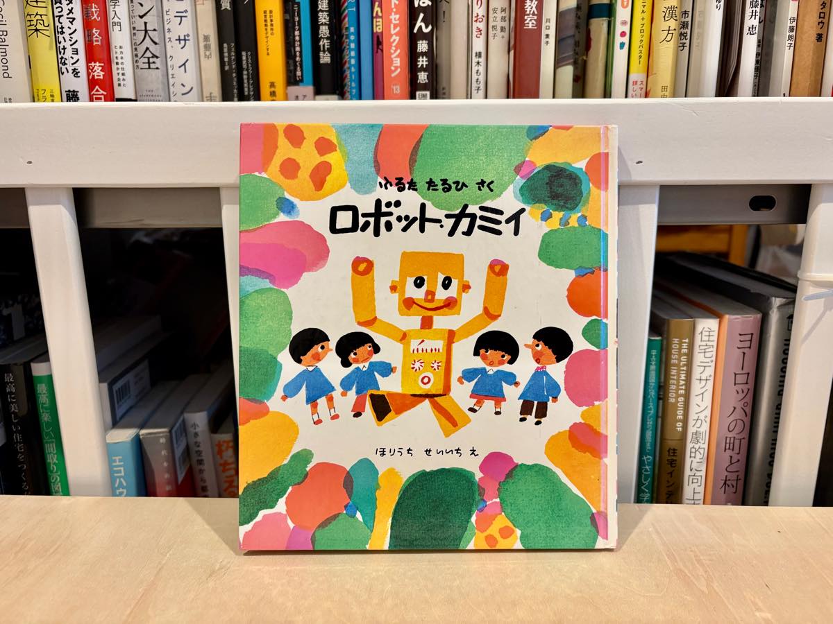 「パパのところに入れてー。」と、子ども用の絵本棚には入れてもらえず、建築系の本の横に佇むロボット・カミィ。
