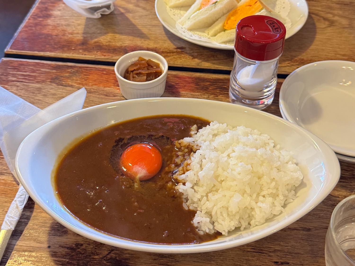 朝からカレー卵トッピング。定番にたまごサンドもいただきました。