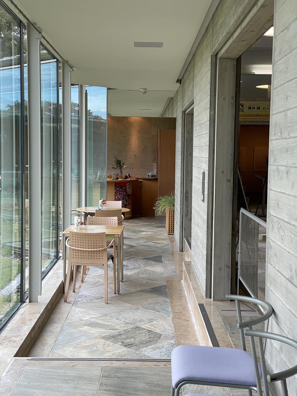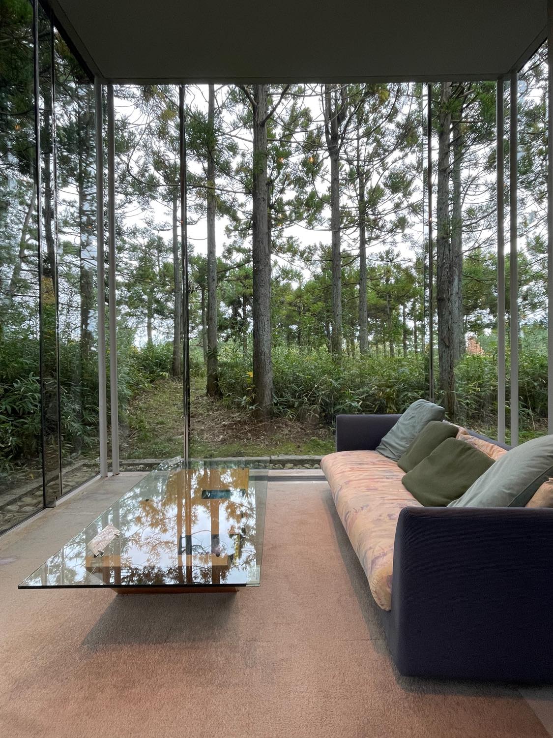 奥の部屋に行くと3面ガラス張りの休憩スペースがありました。周りが木々で囲まれているので開放的でありながら落ち着く空間で、長居したくなる場所でした。