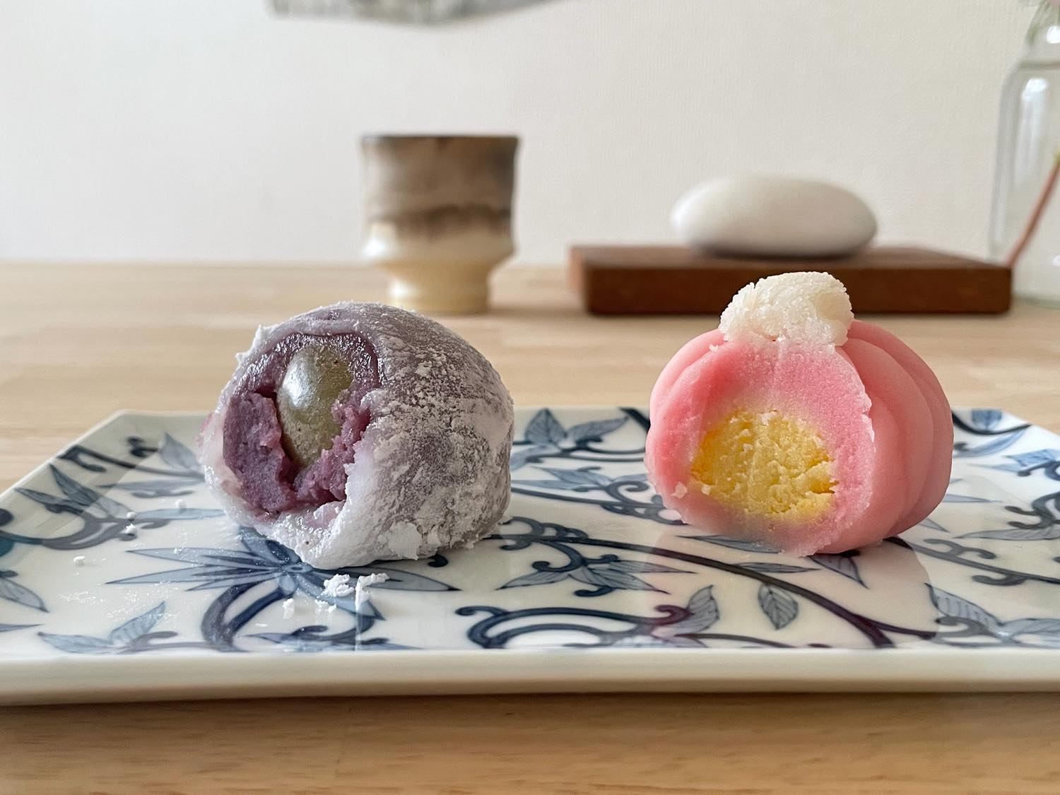 半分に割ると、大福には葡萄が一粒、上生菓子は黄味あんが包まれていました。