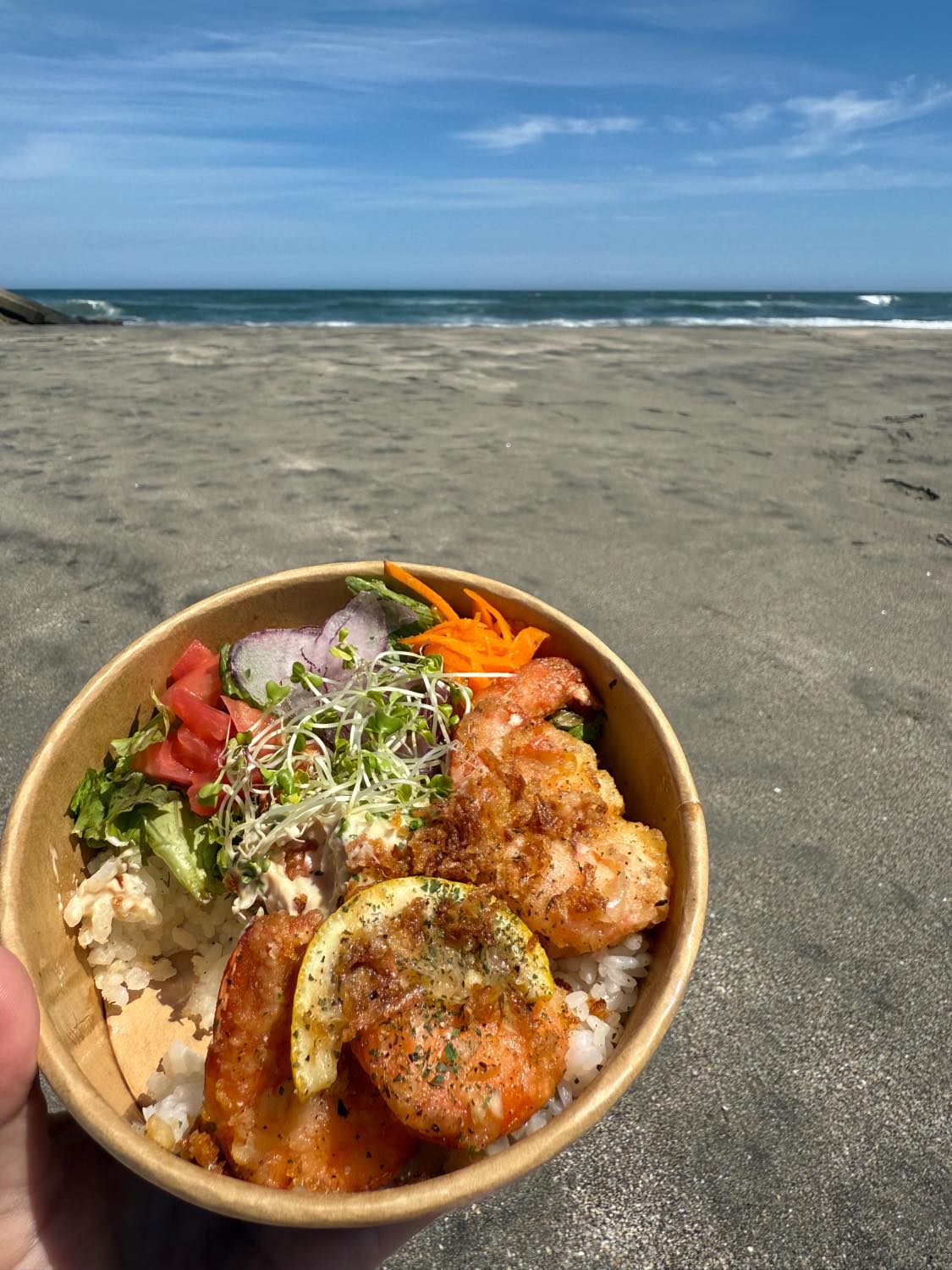 途中、お腹が減ったら近くのカフェでガーリックシュリンプボウルをテイクアウト。