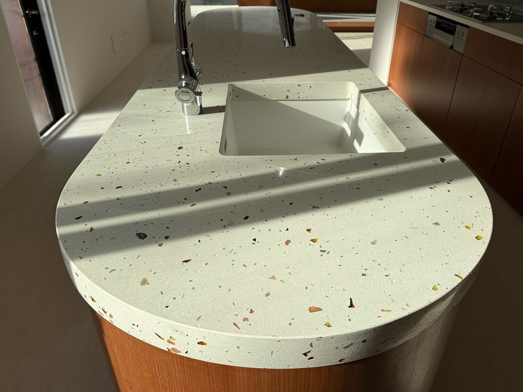 何度もお打合せを重ねて、ストーンの大きさや色、散りばめる割合を、サンプルでとことん検証した天板です。