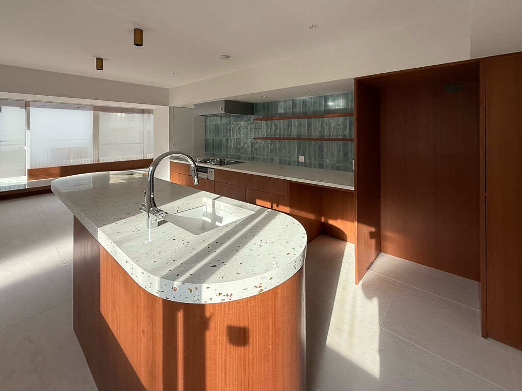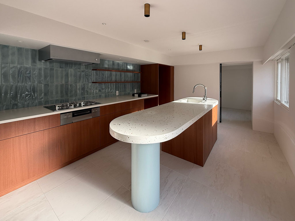 ラウンド型のアイランドカウンターは暮らしをやさしく受け止めてくれそう。