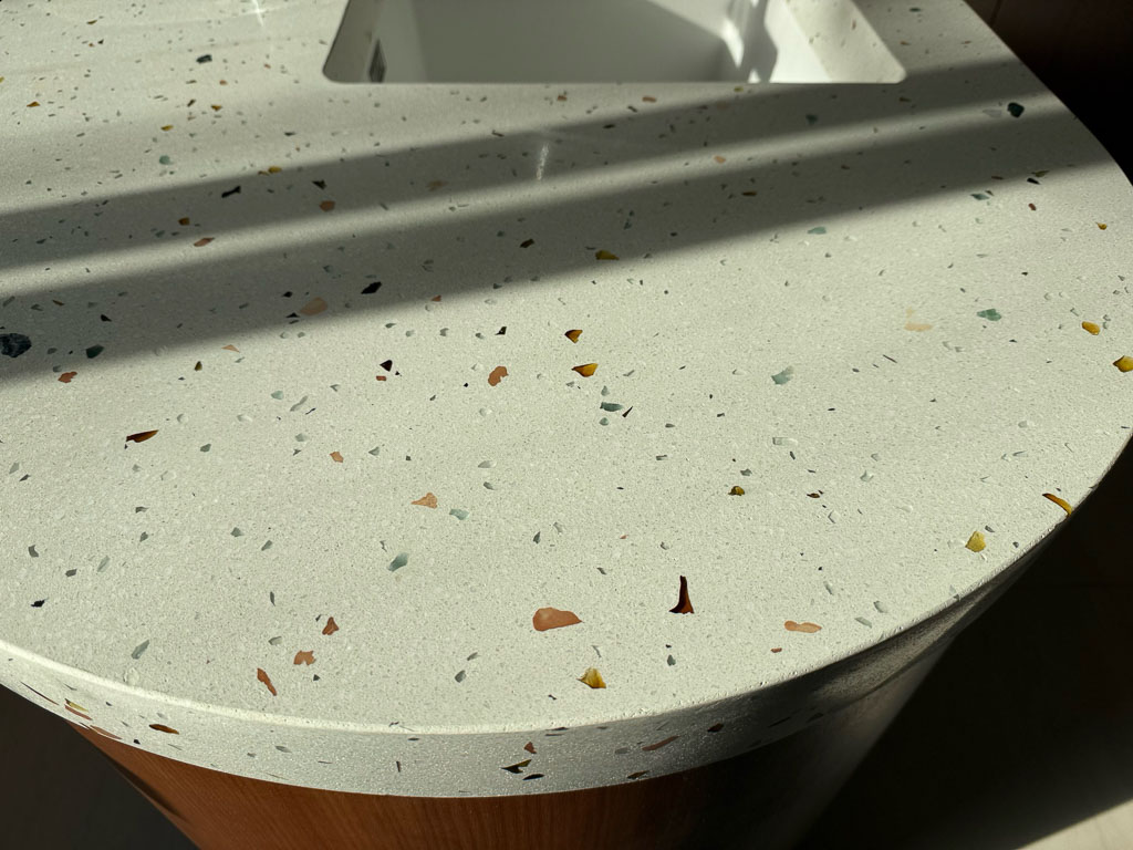 何度もお打合せを重ねて、ストーンの大きさや色、散りばめる割合を、サンプルでとことん検証した天板です。