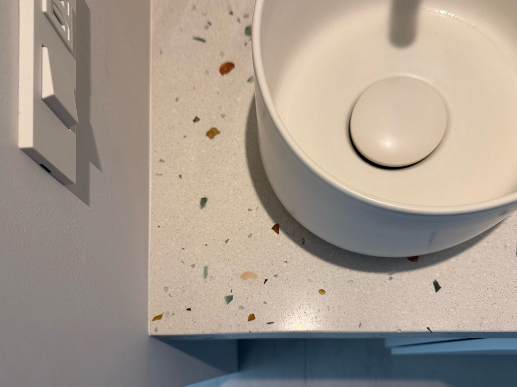 白ベースの左官材に、カラフルなストーンが散りばめられています。