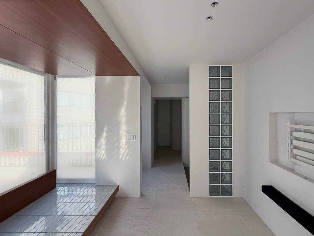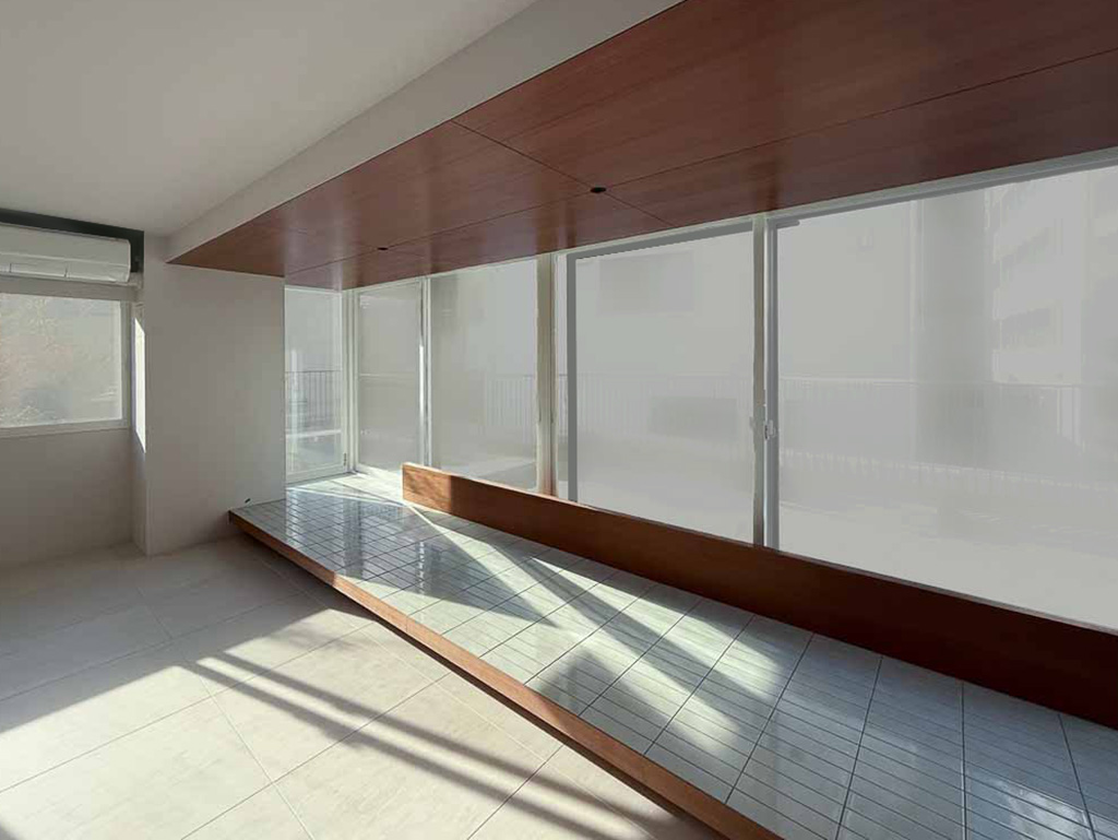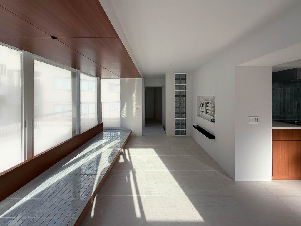 たっぷりと広さを確保した小上がりは、白い磁器質タイル仕上げに。