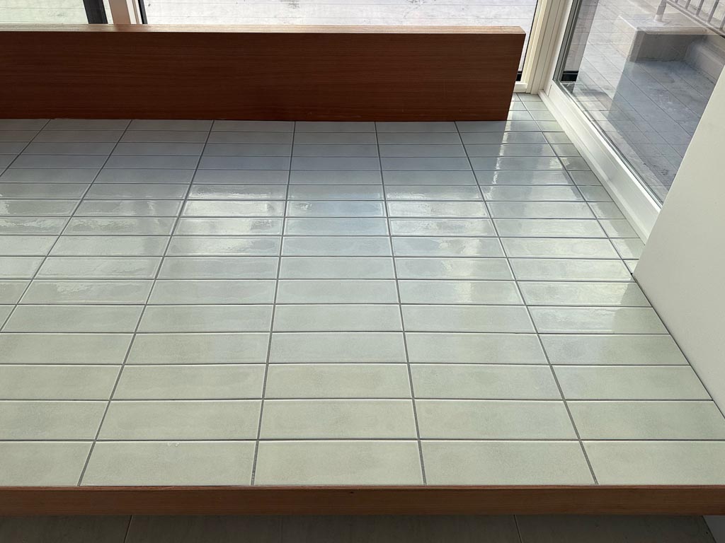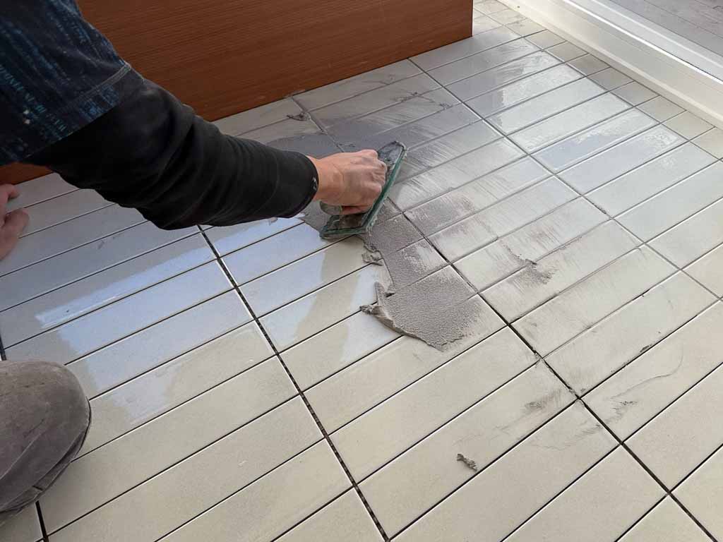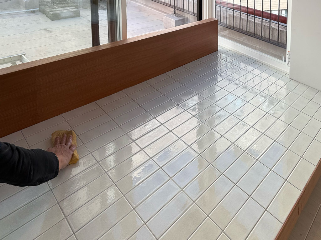 タイル仕上げの最後の工程である、目地入れの様子をちらり。
