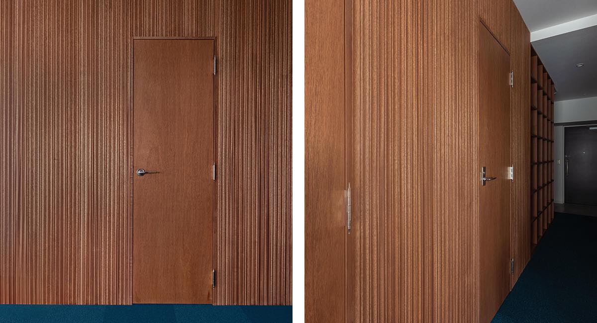 木張り仕上げで使用する素材の中でも、表面が凹凸になっているリブ材は陰影の美しさが際立つ素材。自然光を受けて次第に色合いが変化し、陰影の深まりも愉しめます。
