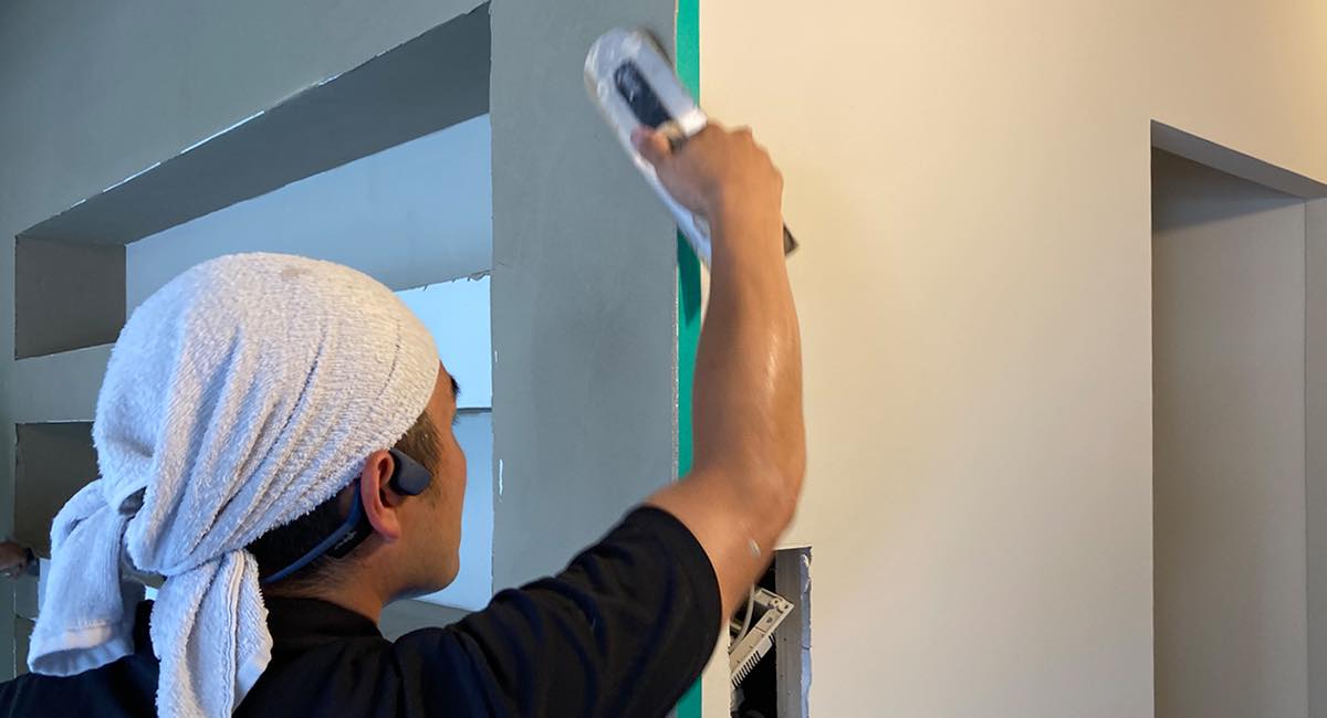 左官工事は、丁寧さとスピード感の両立が求められる繊細な作業。素材の乾きや温度を瞬時に見極め、呼吸を合わせながら一気に仕上げていきます。