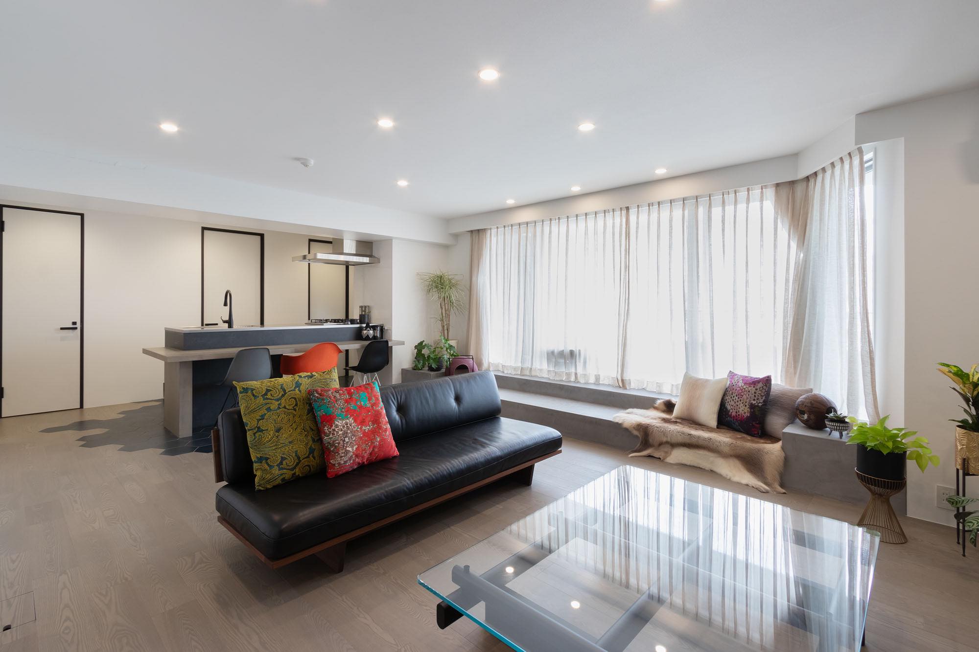 大きなカウチソファに加え、窓辺にモールテックスベンチを造作し、同じ空間を共有しながら、思い思いの時間を過ごす居場所を点在させました。