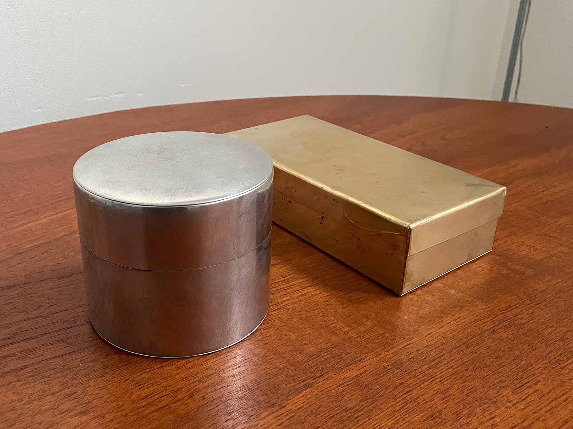 実際に手に取ると、無駄のない佇まいの中に静かな存在感があり、毎日の生活に自然と溶け込んでくれます。▲ 左:丸缶 (大/ブリキ) 、右:角缶 (小/真鍮)