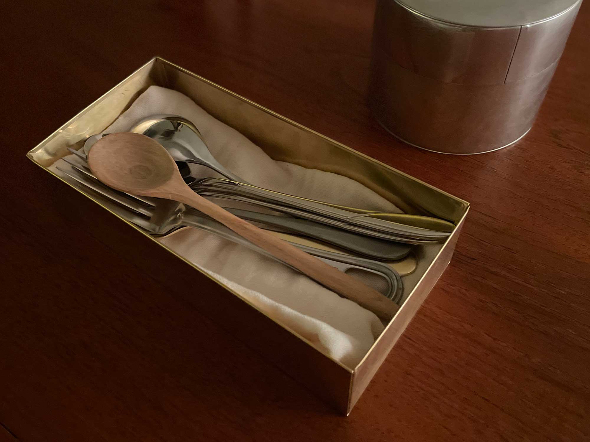 そして真鍮の角缶は、カトラリー入れとして使っています。