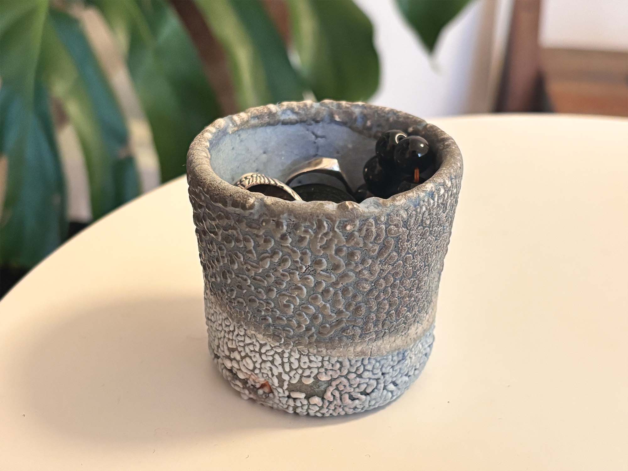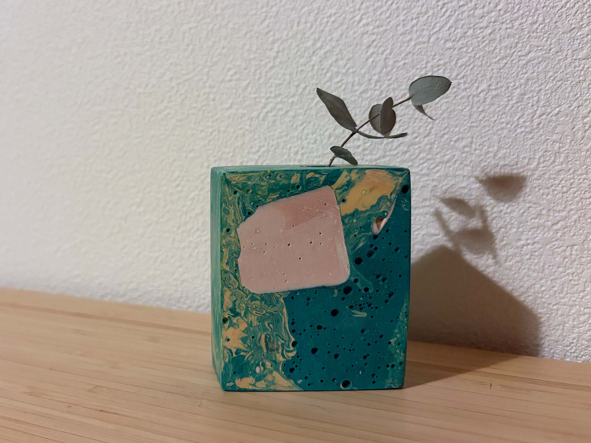 自然素材と樹脂が溶け合うように重なり合い、ひとつとして同じ表情のない佇まいは、小ぶりでありながら空間に静かな存在感を添えてくれます。