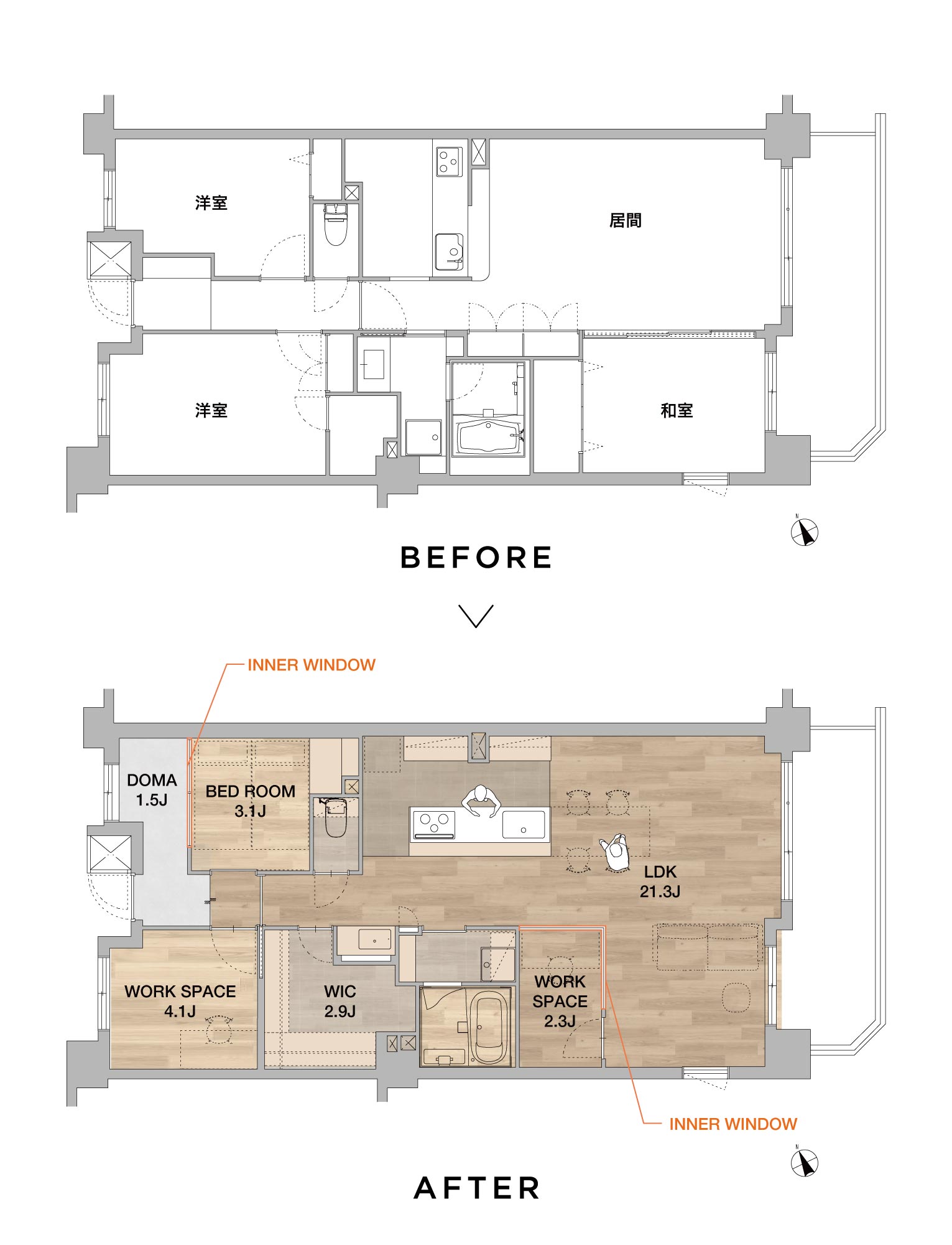 必要なときに気配を感じ、それぞれのペースを尊重する。空間も、時間も、ほどよくシェアする。生活リズムが異なるお二人がストレスなく暮らすための工夫を散りばめ、心地よいバランスを追求した空間です。