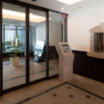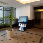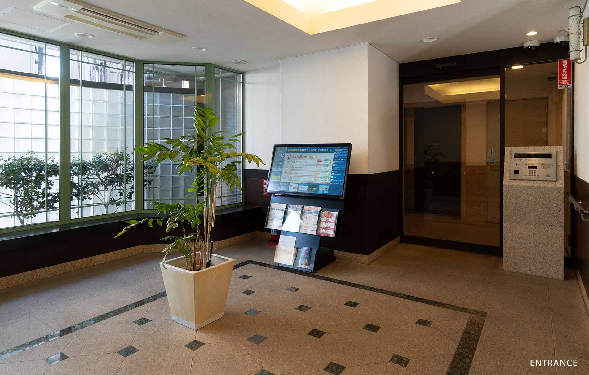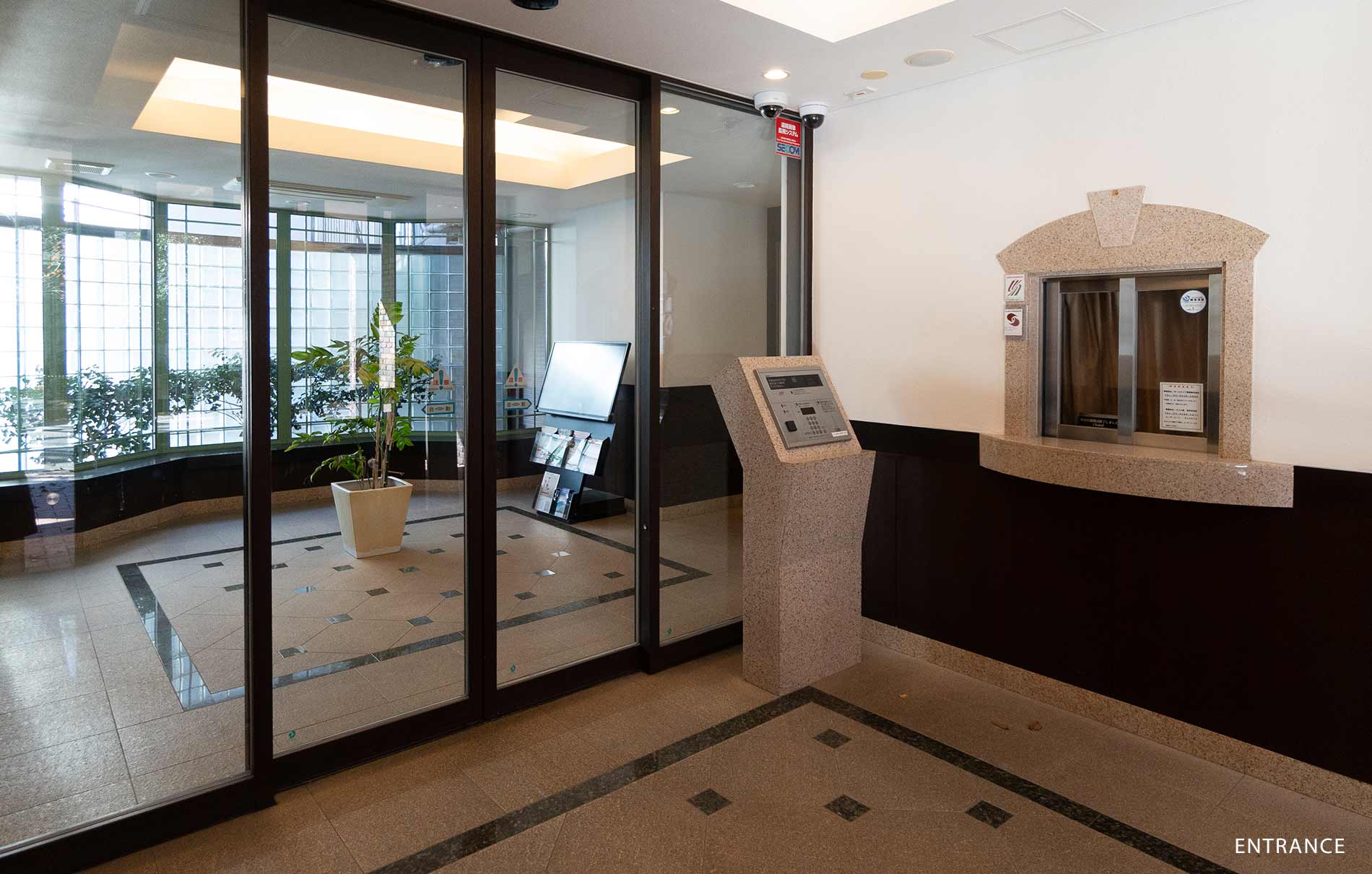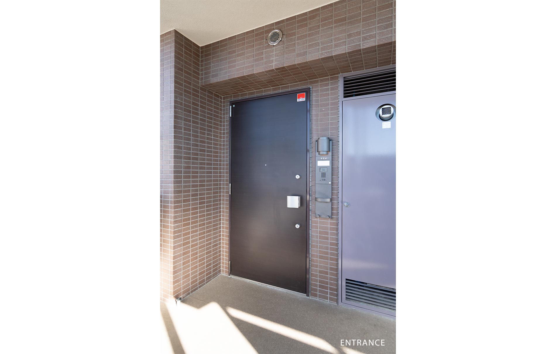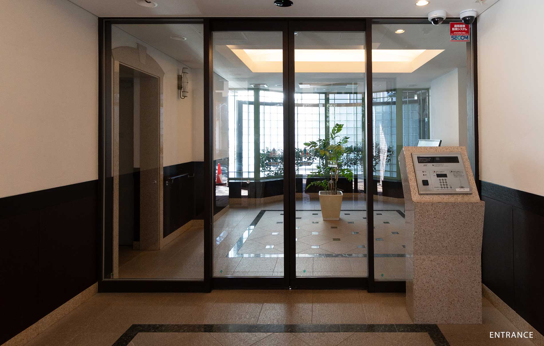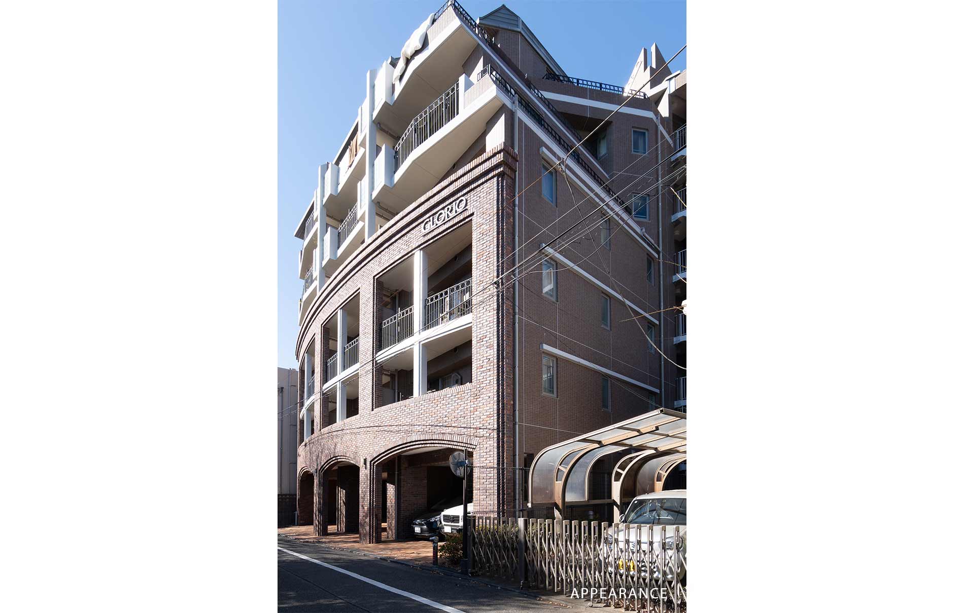重厚感漂うタイル張りの外観とガラスブロックを用いた専有部は、上質さを感じる設え。