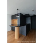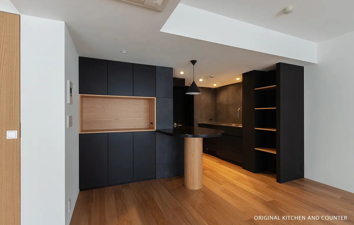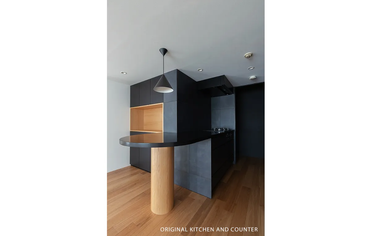 黒とオークを基調としたキッチンスペースは半円形のカウンターを造作してコンパクトに設え、