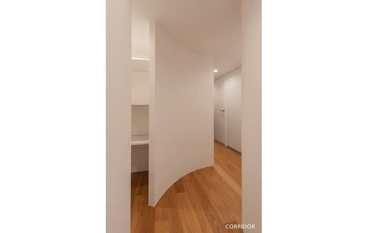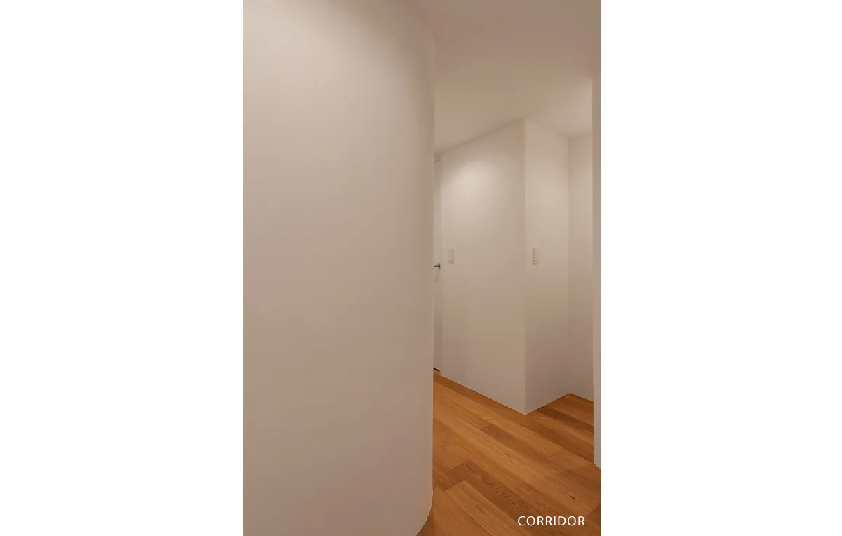 エントランスの正面に続く廊下は曲がり角をカーブさせ、訪れる人をやさしく迎え入れる空間に。