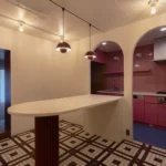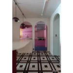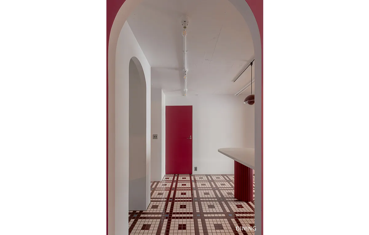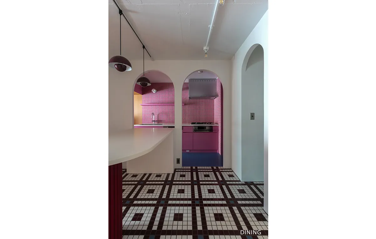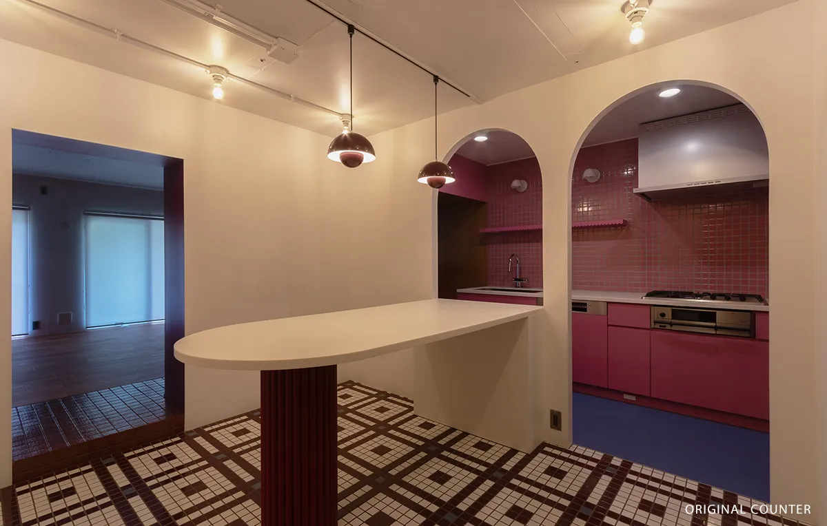 アールの意匠とカラフルな色使いが印象的なダイニングキッチンは、そこにいるだけで心がほどける場所。