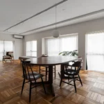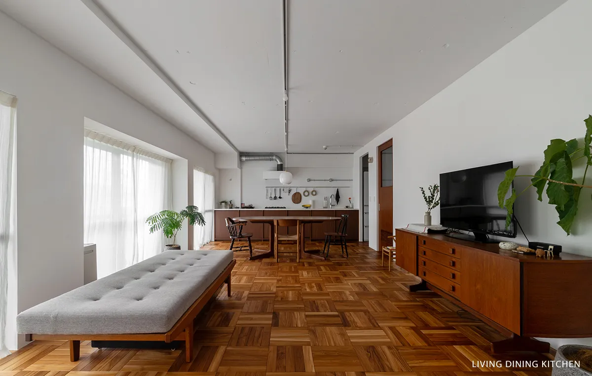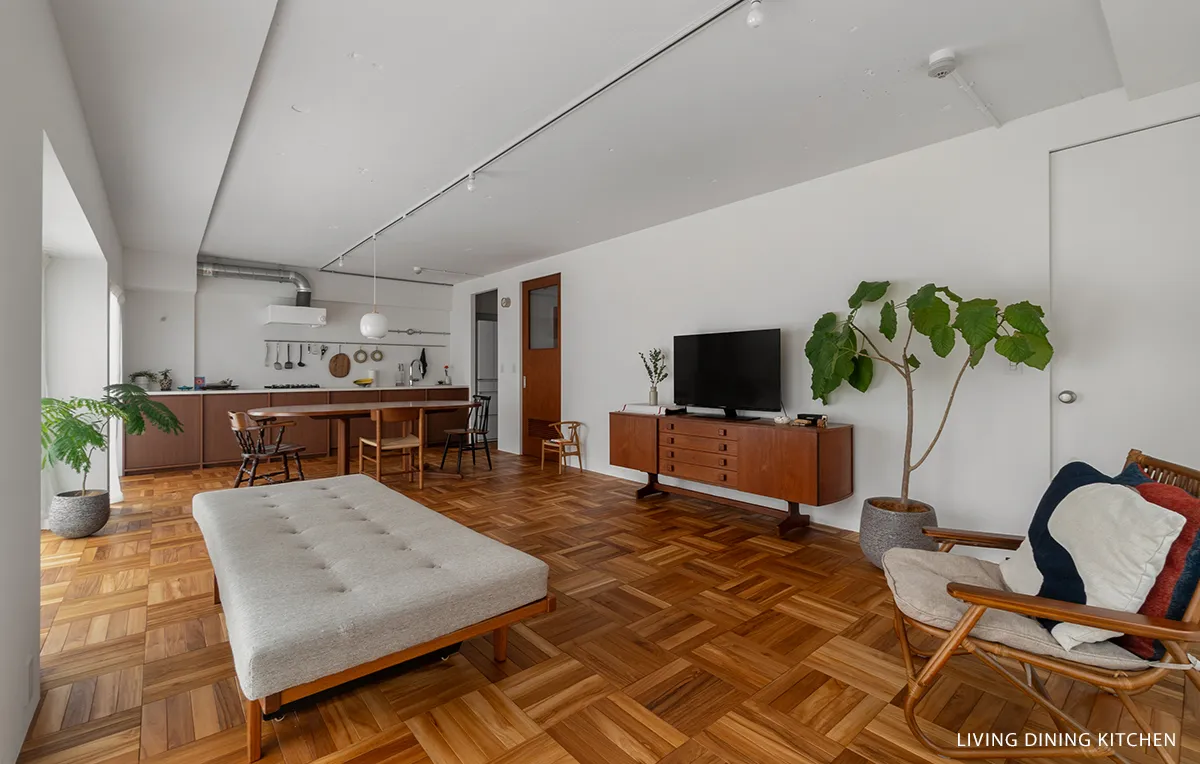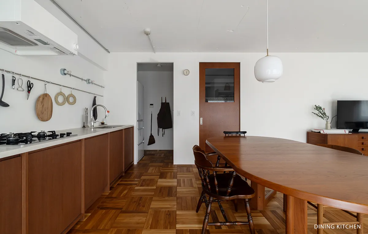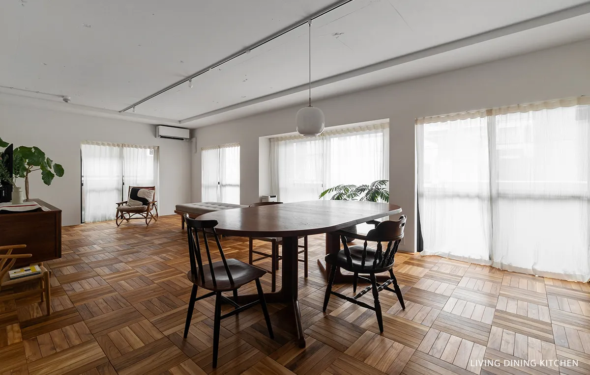 ありのままの美しさ市松模様に敷き詰めたパーケットフローリングや柔らかな温もりを感じるエッグペイントの壁など、