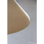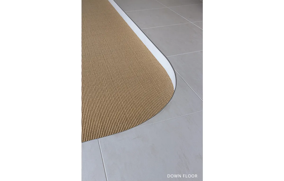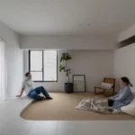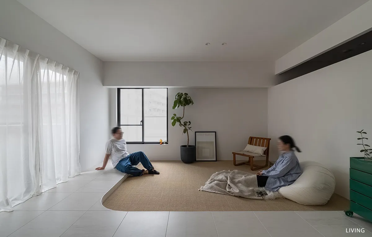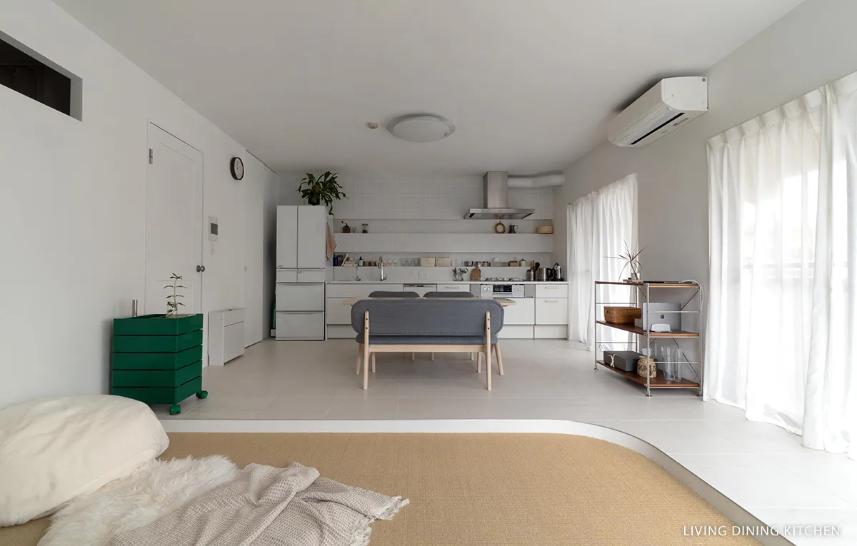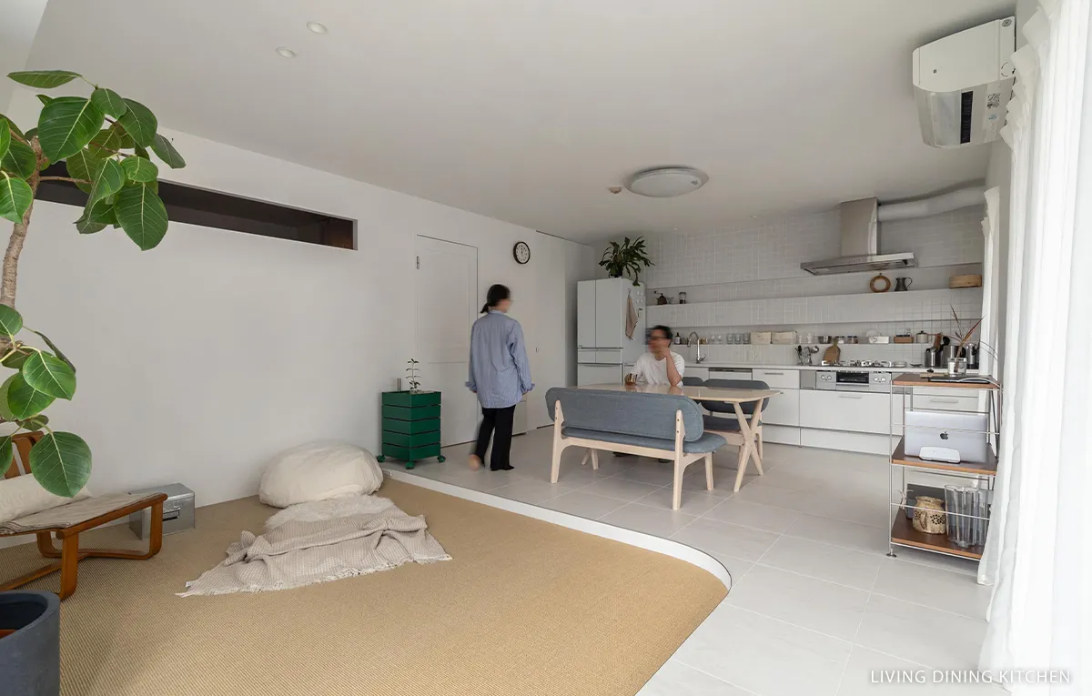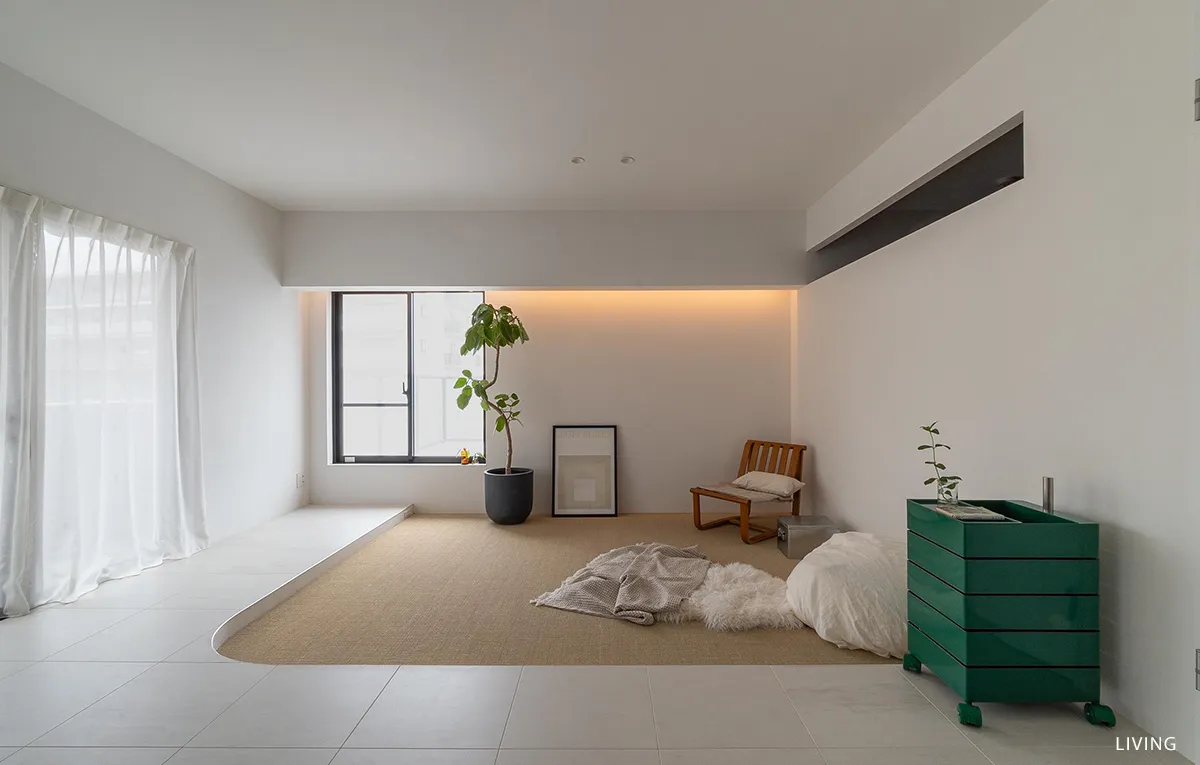 ライトカーキのサイザルで仕上げたリビングはベージュタイルのフロアから13cmの段差をつけ、