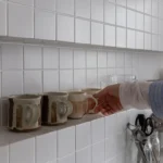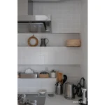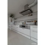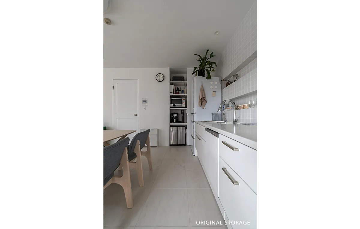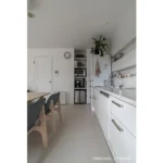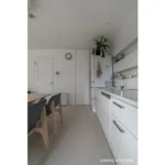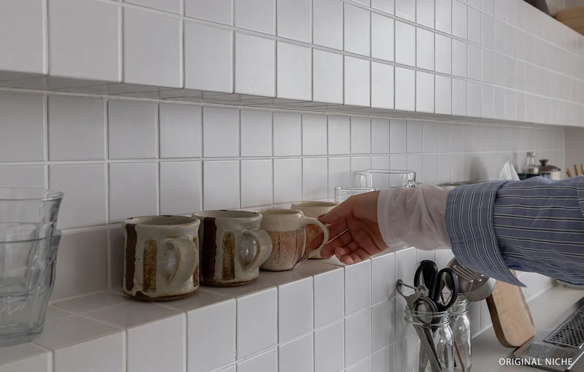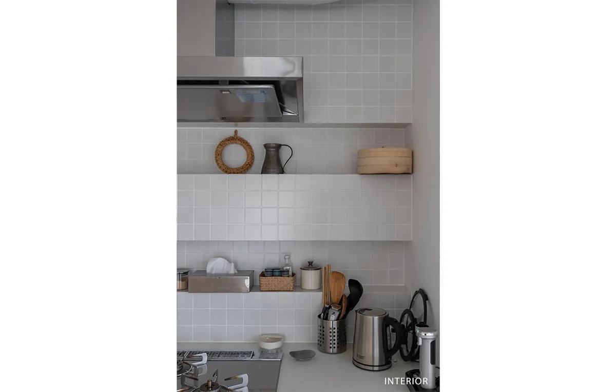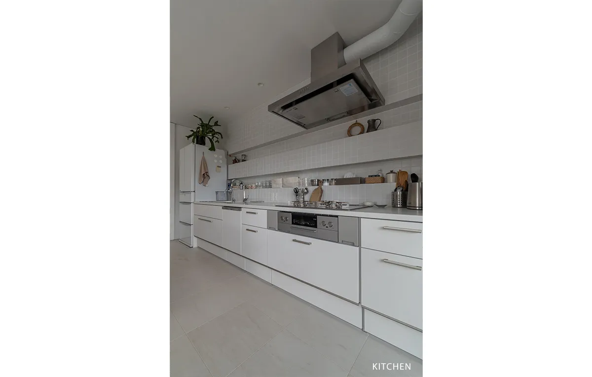 真っ白な壁付けキッチン、壁一面に張り込んだホワイトタイル、白塗装の壁…。