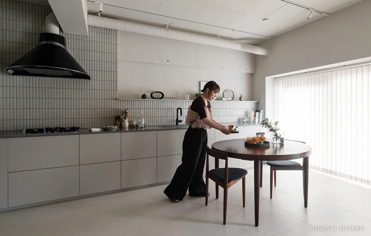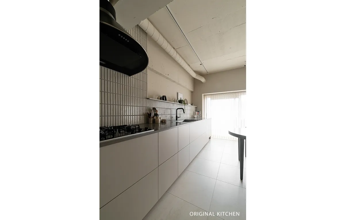 壁付けの造作キッチンは正面の壁を大きく掘り込み、タイルと躯体の対比を愉しむデザインに。