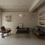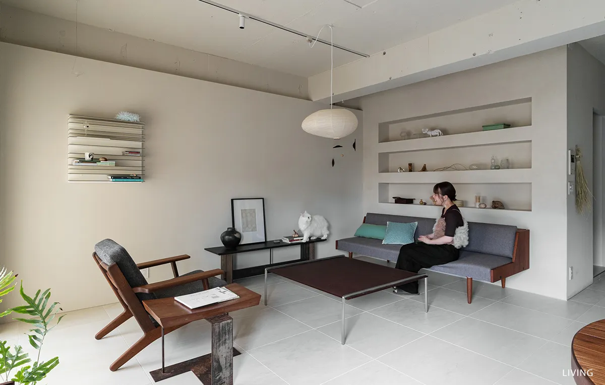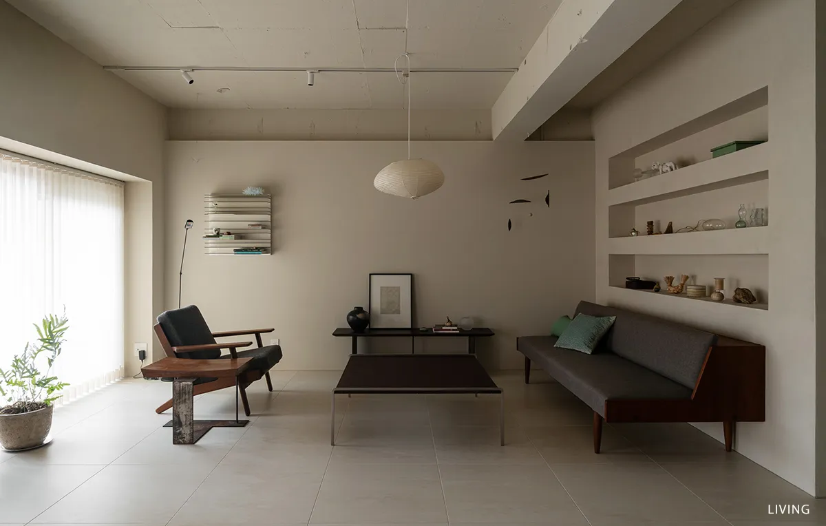 ベージュを纏ったノイズレスな空間に佇む、使い込まれたヴィンテージ家具たち。