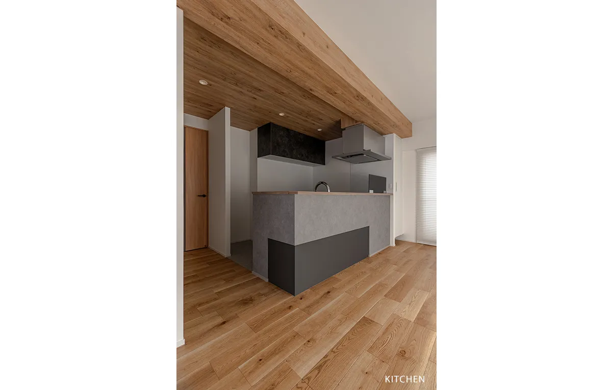 木目天井のキッチンは、ナチュラルになりすぎないよう腰壁に濃淡グレーのアクセントをプラス。