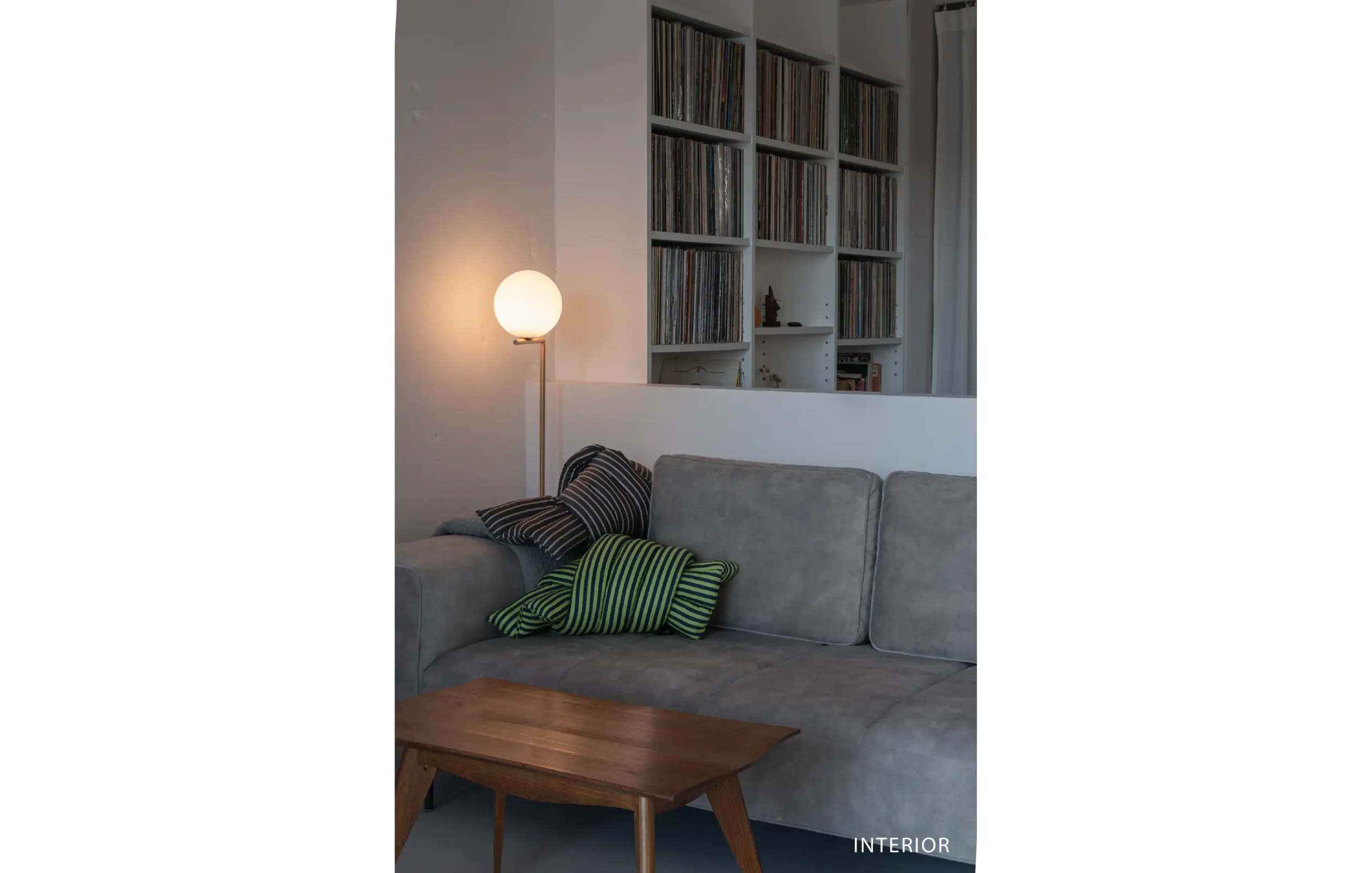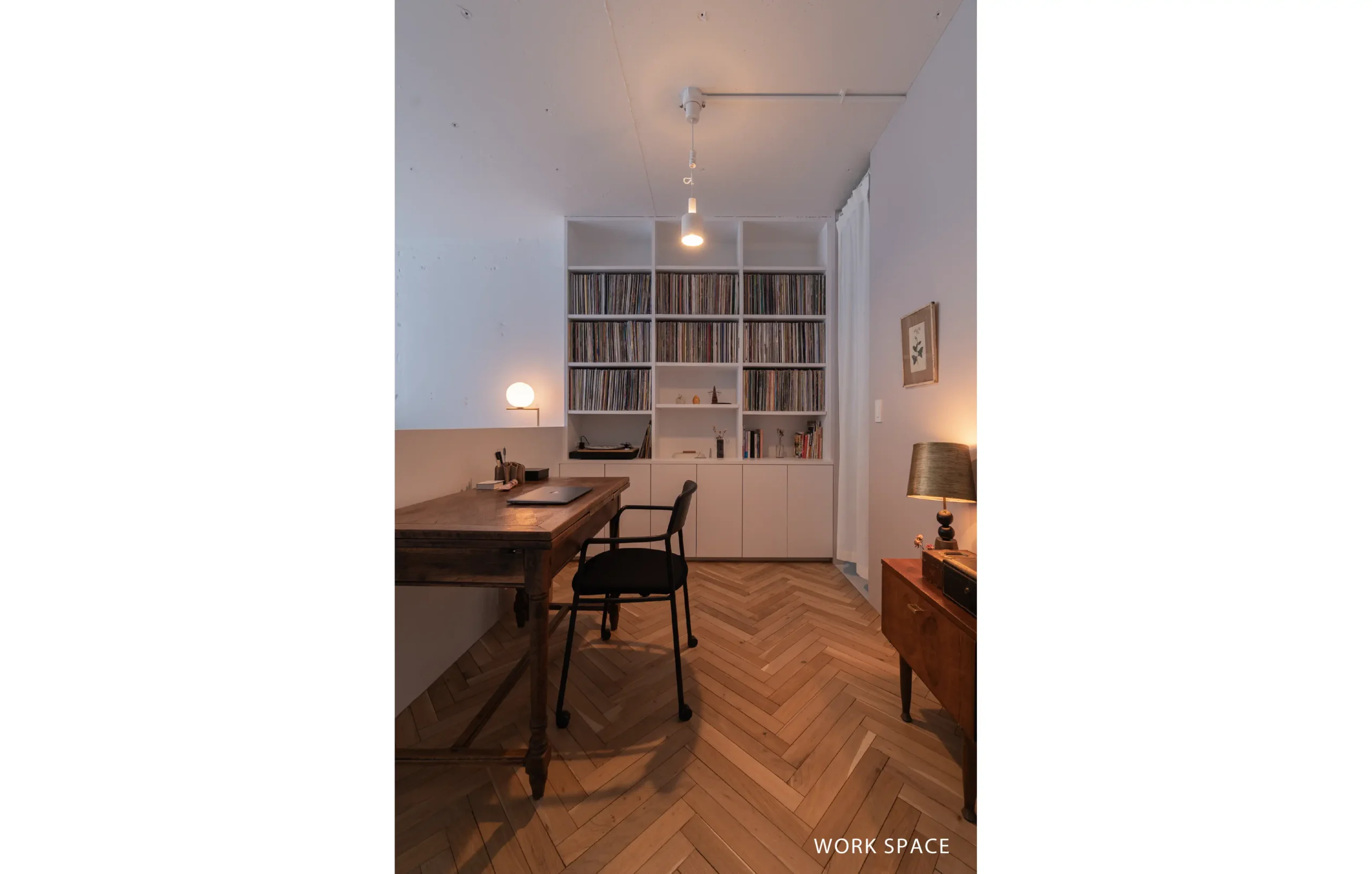 造作のオープン収納にずらりと並べたレコードをインテリアの一部として愉しみます。