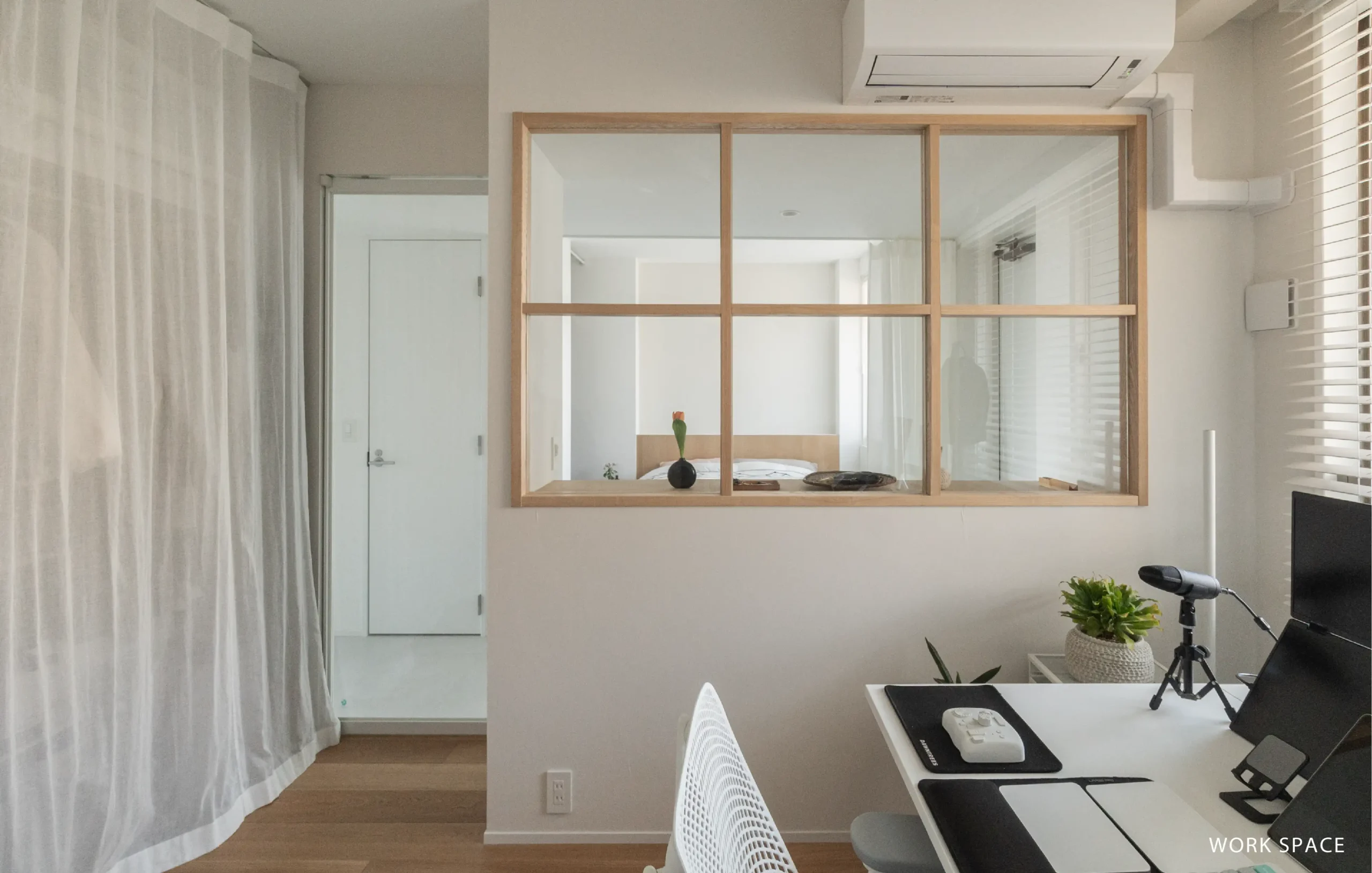 しっかりと個室化したご主人のワークスペースはガラスの扉、内窓を設え光の溢れる空間に。