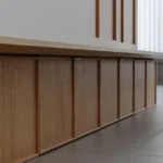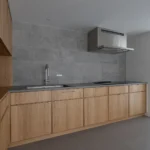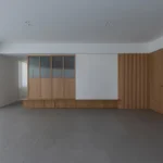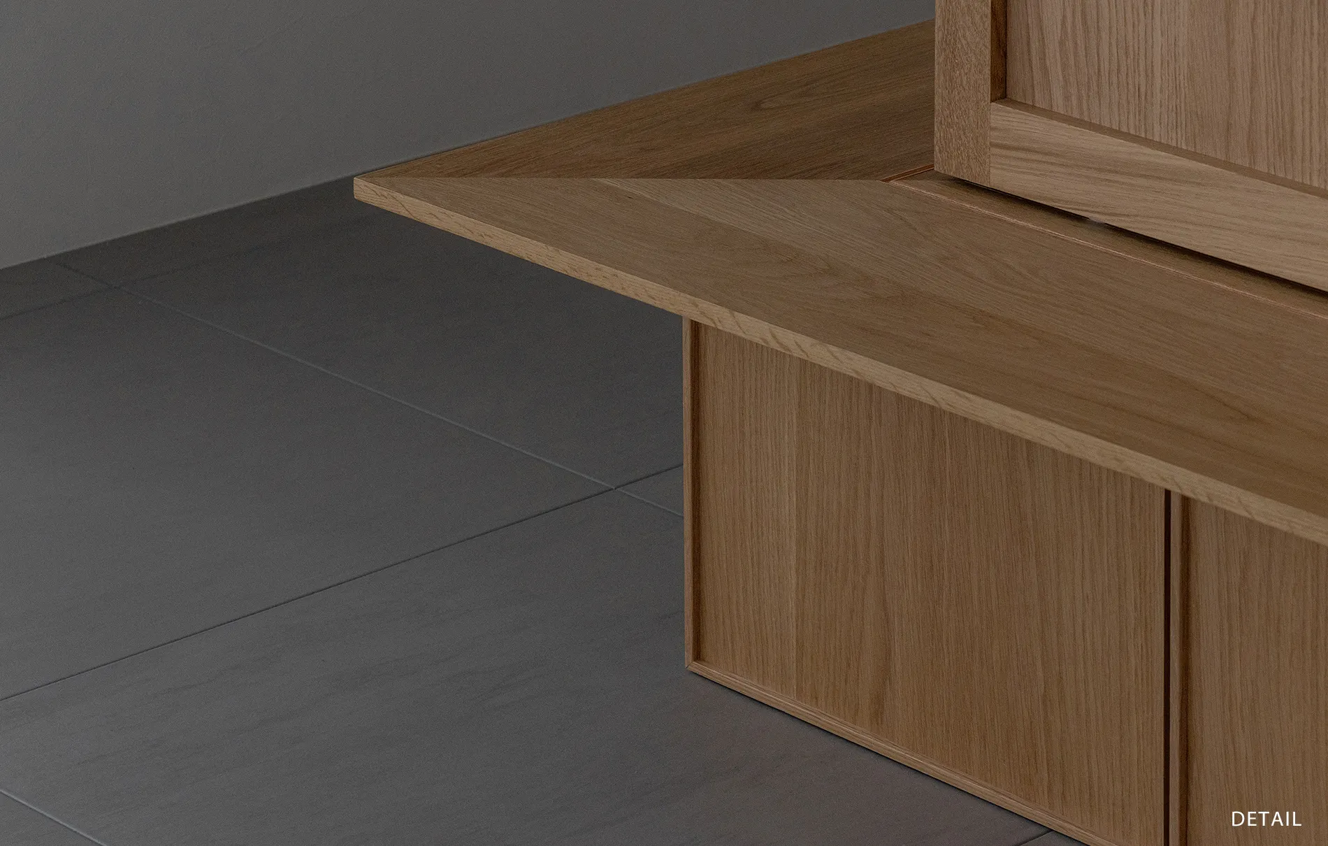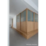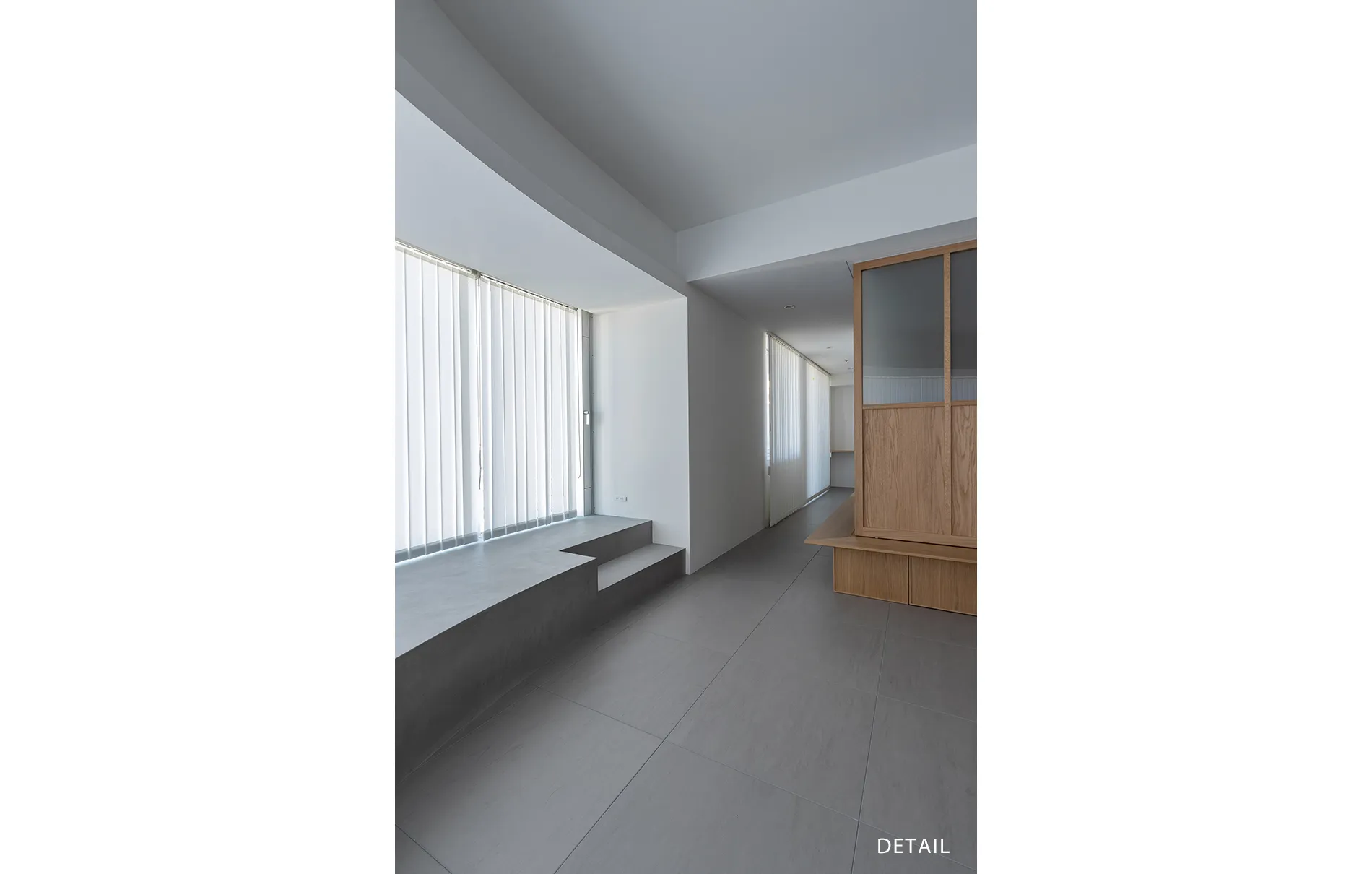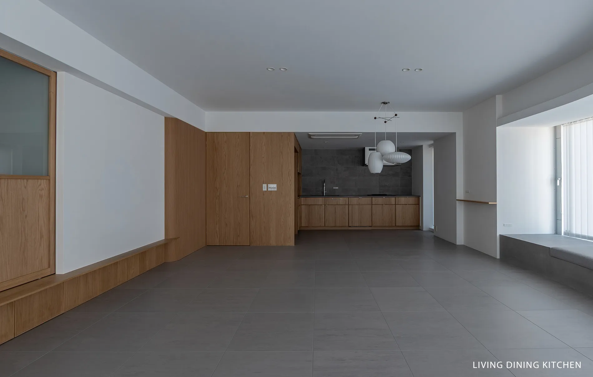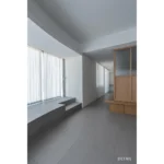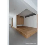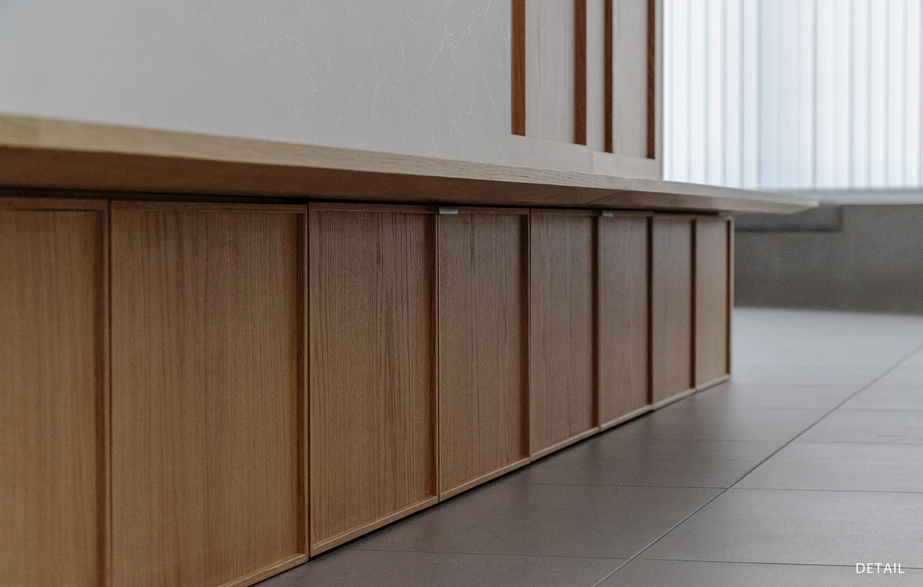 無機質な素材感でまとめた床面とは対照的に、縁側や建具、壁などの立ち上がりには