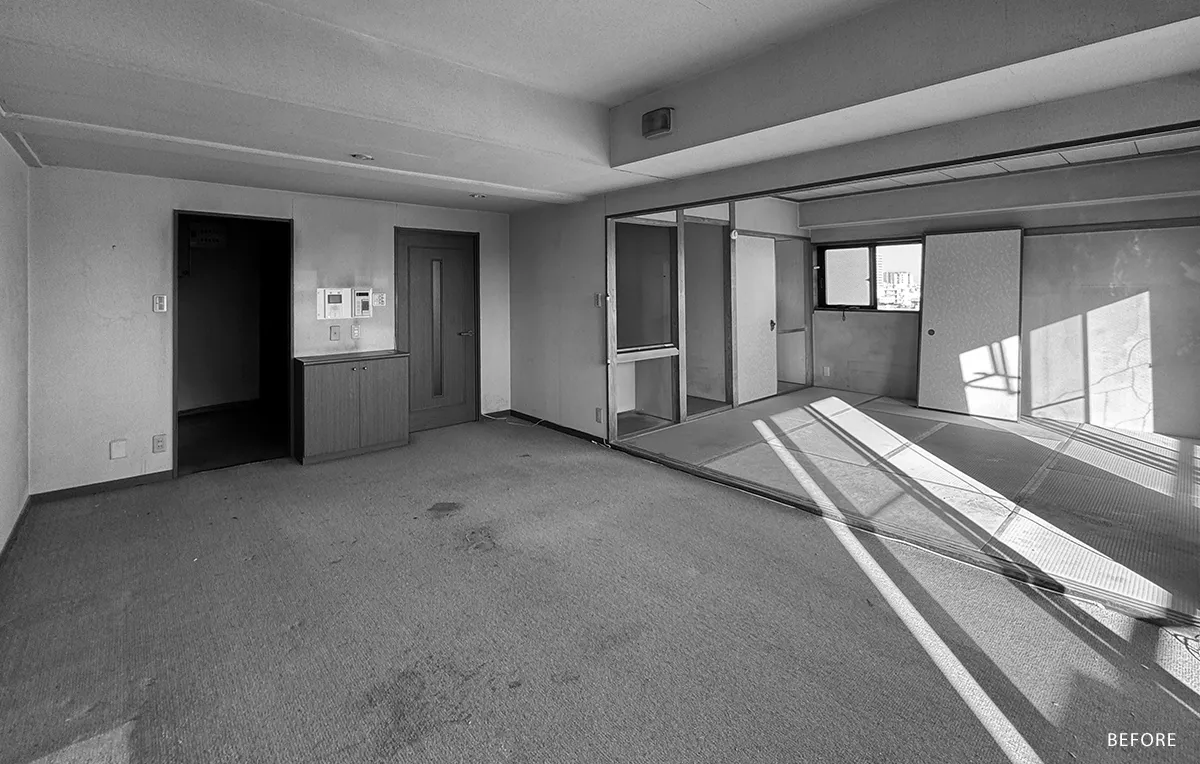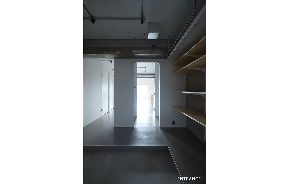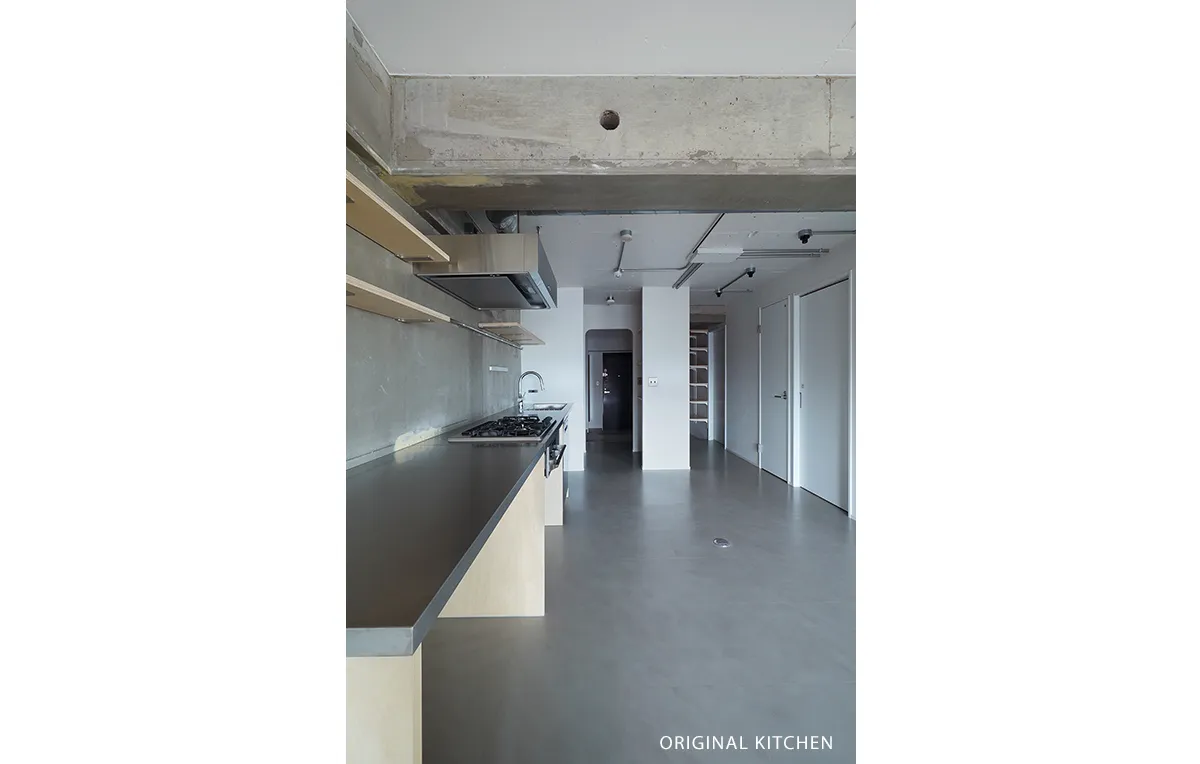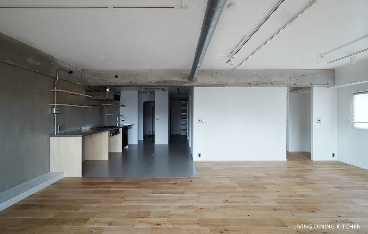 床、壁、天井がグレーで統一された無機質なリノベーション空間..