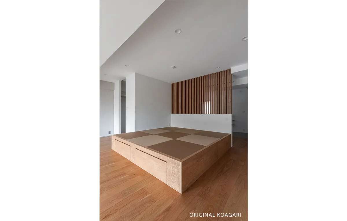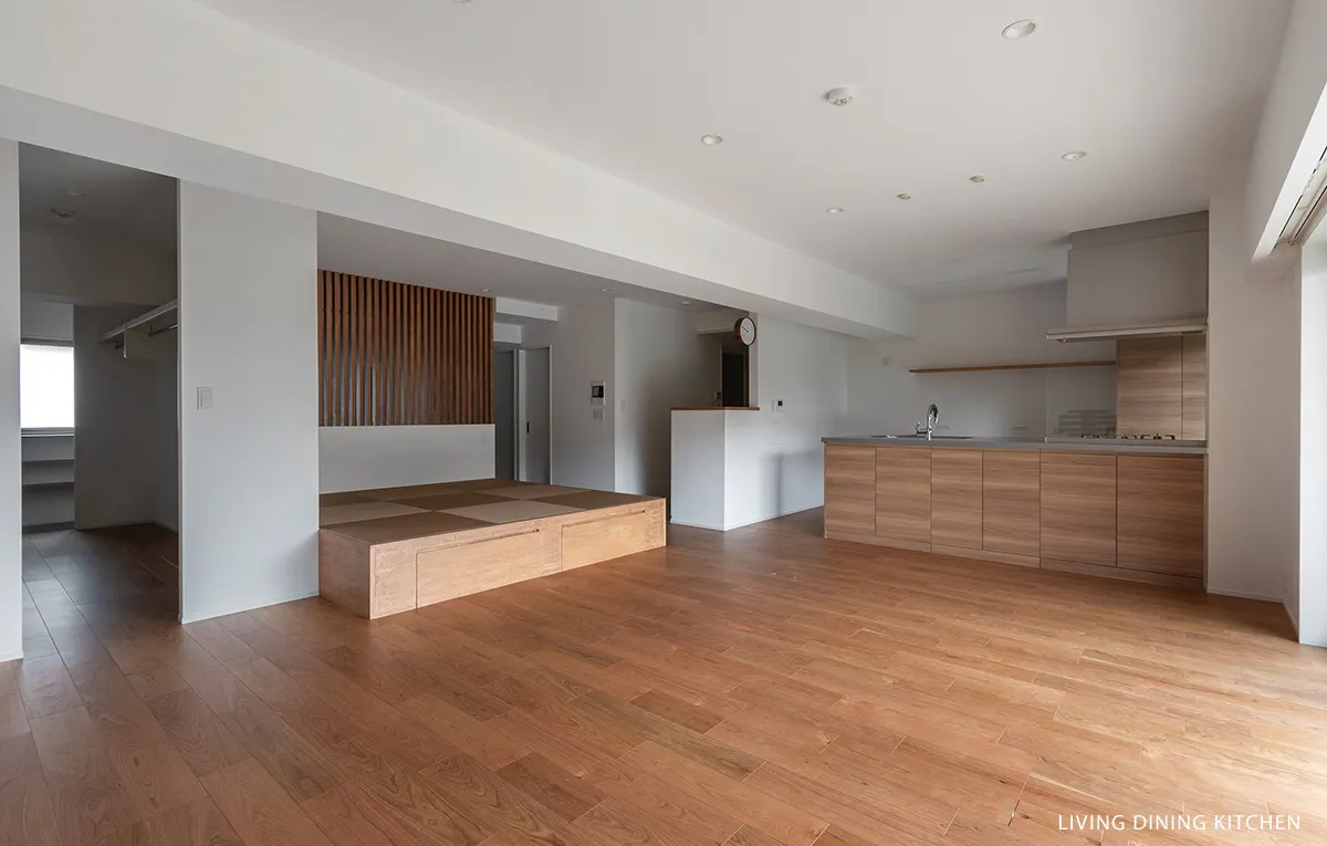 柔らかな環陽だまりのように心地がいい、小上がりの畳スペースを中心とした回遊的な空間。