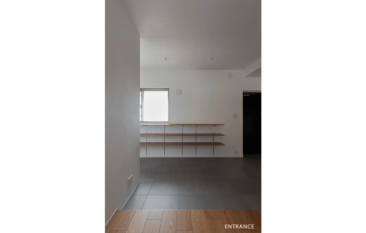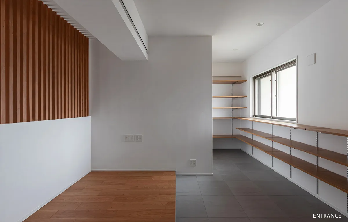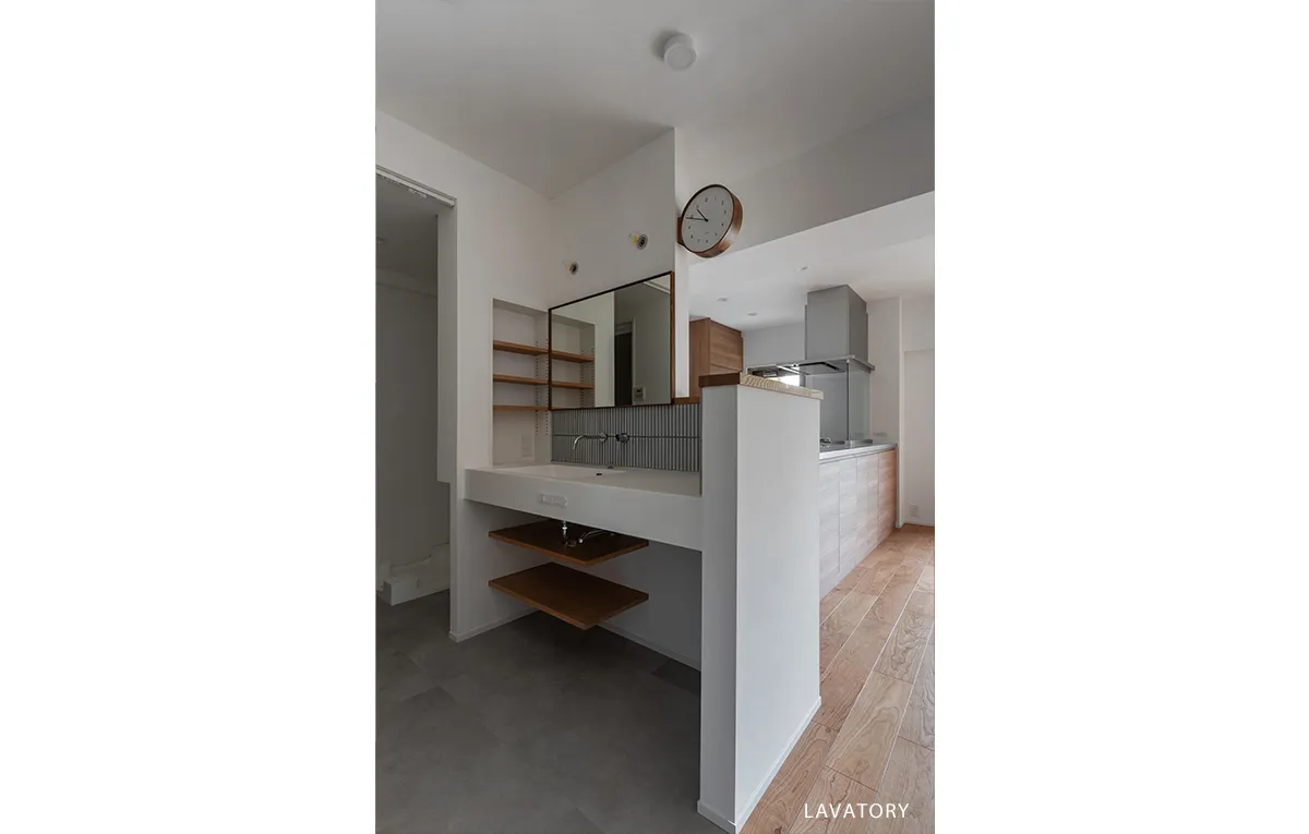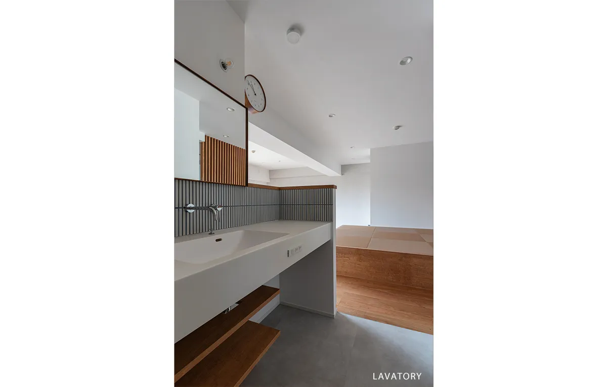 セミオープンでしつらえた洗面室や玄関土間にはグレーのタイルで無彩色のアクセント。