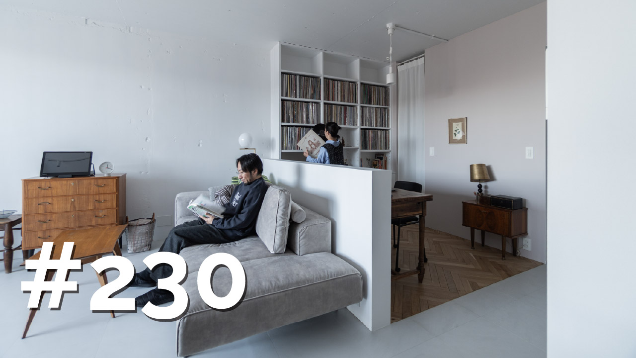 LDKはたっぷり16.2畳を確保。躯体現しを白塗装した天井やグレーの塩ビタイルの床で、静かな印象にしました。リビングの一角には奥様のワークスペースを設け、腰壁とナラ材のヘリンボーン床で視覚的にゾーニング。かつてレコードショップを営んでいた奥様のレコードコレクションを1000枚以上収めるために、大型の壁面収納を造作しました。